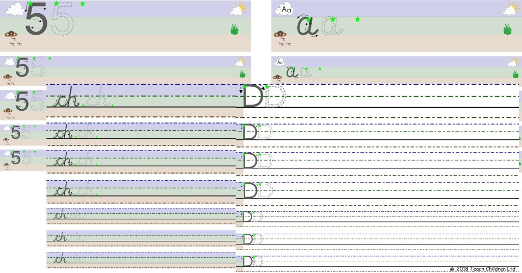 At Teach Children our aim is to move children off of worksheets as soon as possible. To achieve this, it is important to encourage them to transfer their skills to plain or lined paper whichever is most appropriate to their ability level. We realise that it is not always possible to buy paper with the appropriate line height in all cases, so would recommend creating your own on the computer.