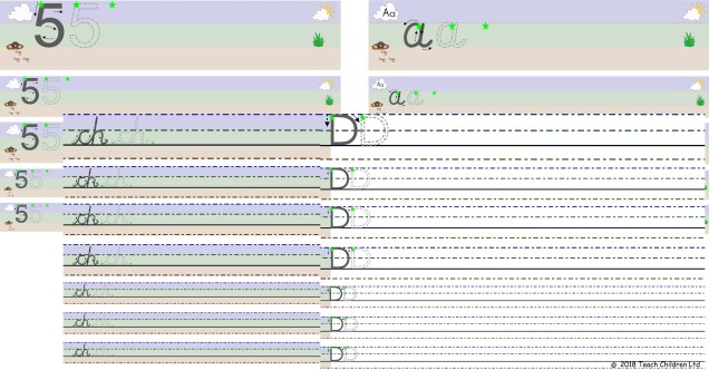 On our website the free writing paper and animations reinforce the idea of letter proportions and positioning by splitting the backgrounds into three colour zones to represent the sky, grass and earth. There are a number of reasons why this can be beneficial: