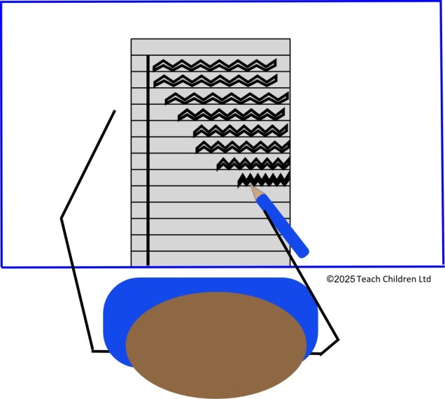 This means that, as the child writes their writing hand movies down the page (often until they reach the end of the table) and their elbow moves back behind their body. As this happens, they will also tend to move back away from the table slightly. The result being that as they move down to the next line their body is physically starting to blocking them from returning to the margin. So, they start to write at a point that they physically are able to reach, moving further away from the margin the further down the page they go.